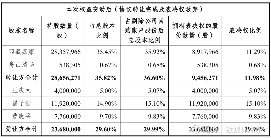 为确保控制权平稳过渡,原控股股东西藏嘉康已承诺将持有的1944万股全部申报预受要约且不可撤回,并提前放弃该部分股份的表决权。