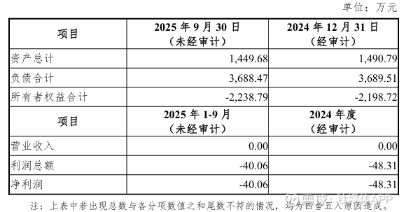 这家成立于2015年、注册资本1723万元的企业,已连续两个完整会计年度无营业收入,2024年及2025年前三季度分别亏损48.31万元和40.06万元,截至2025年9月末所有者权益为-2238.79万元,早已资不抵债。