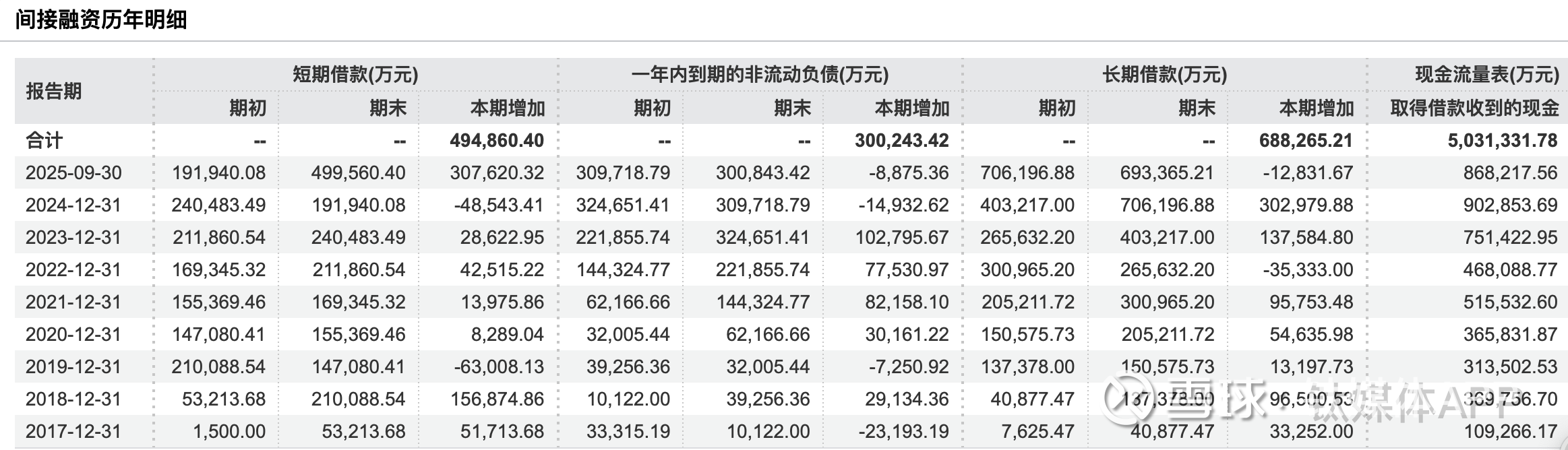 同时,2017年开始,公司短期借款逐年大幅累计,从2016年末的1500万元增加到2025年9月30日的49.96亿元;长期借款同步垒高,从7625.47万元增加至69.34亿元。
