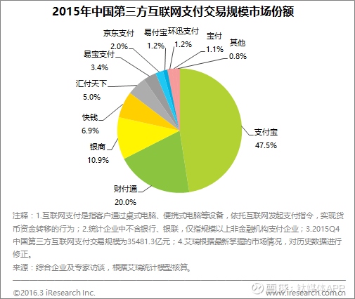 艾瑞咨询统计的数据显示,2014年,中国互联网第三方移动支付市场,支付宝的份额高达82.8%;2015年,支付宝虽然依旧位列第一,但市场份额下跌至47.5%,腾讯财付通的市场份额上涨至20%。