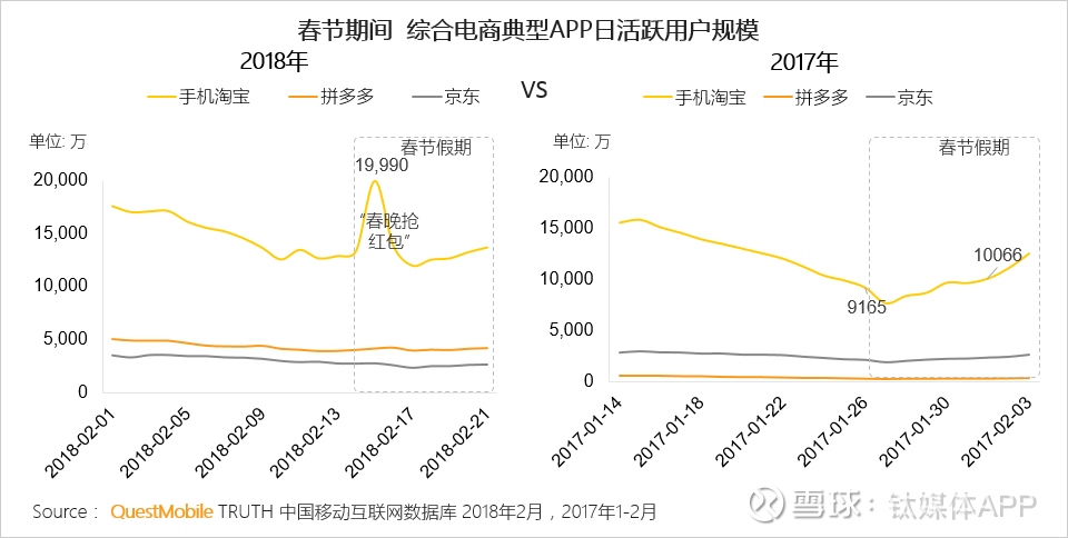 虽然春节历来是电商淡季,但在春晚的带动下,淘宝的用户规模却攀上了新的高峰。QuestMobile数据显示,2018年除夕夜,手淘App日活规模达2亿;日均使用次数为7.9次;日人均使用时长为19.2分钟,显著高于竞争对手。