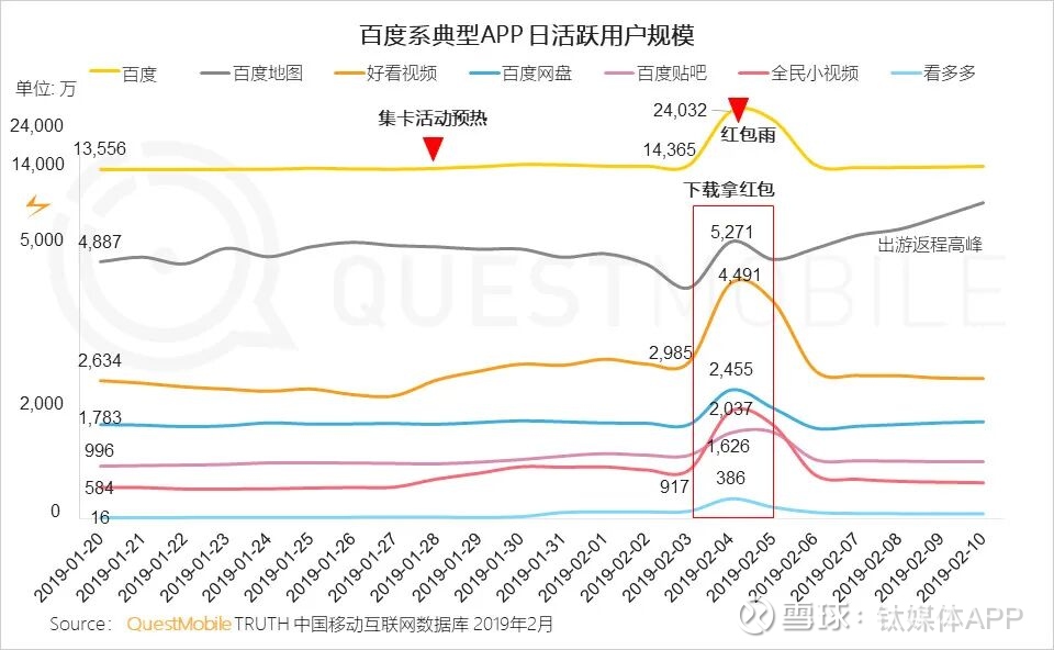 不过需要注意的是,与百度App更多具备工具属性不同,短视频主打算法推荐,拥有较强的普适性价值,虽然春晚营销后,快手、抖音的用户规模有所缩减,但此二者作为新兴平台,也确实靠春晚撬动了一部分增量用户。