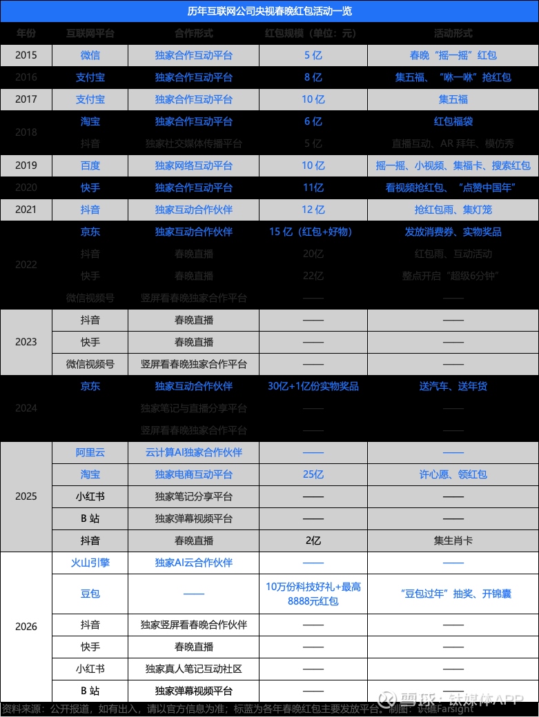据识礁Farsight不完全统计,2015年-2025年央视春晚,互联网企业共投放超180亿元发放红包。
