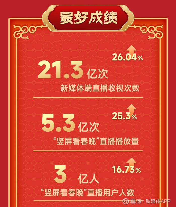 事实证明,牵手新媒体平台后,春晚确实触达了更广的人群。官方资料显示,截至2025年1月29日,2025年春晚在新媒体端直播收视次数达21.3亿次,同比上涨26.04%;“竖屏看春晚”直播播放量达5.3亿次,同比提升25.3%、用户数达3亿,同比提升16.73%。