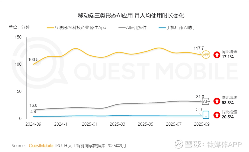 2024年,Gartner披露的调研报告显示,消费级AI应用的30天平均留存率仅为12.8%,比传统移动应用低12.2个百分点。QuestMobile数据显示,截至2025年9月,AI原生App月人均使用时长为117.7分钟,虽然同比上涨17.1%,但日人均仅使用3.92分钟,远不及微信、抖音、小红书等高粘性产品。