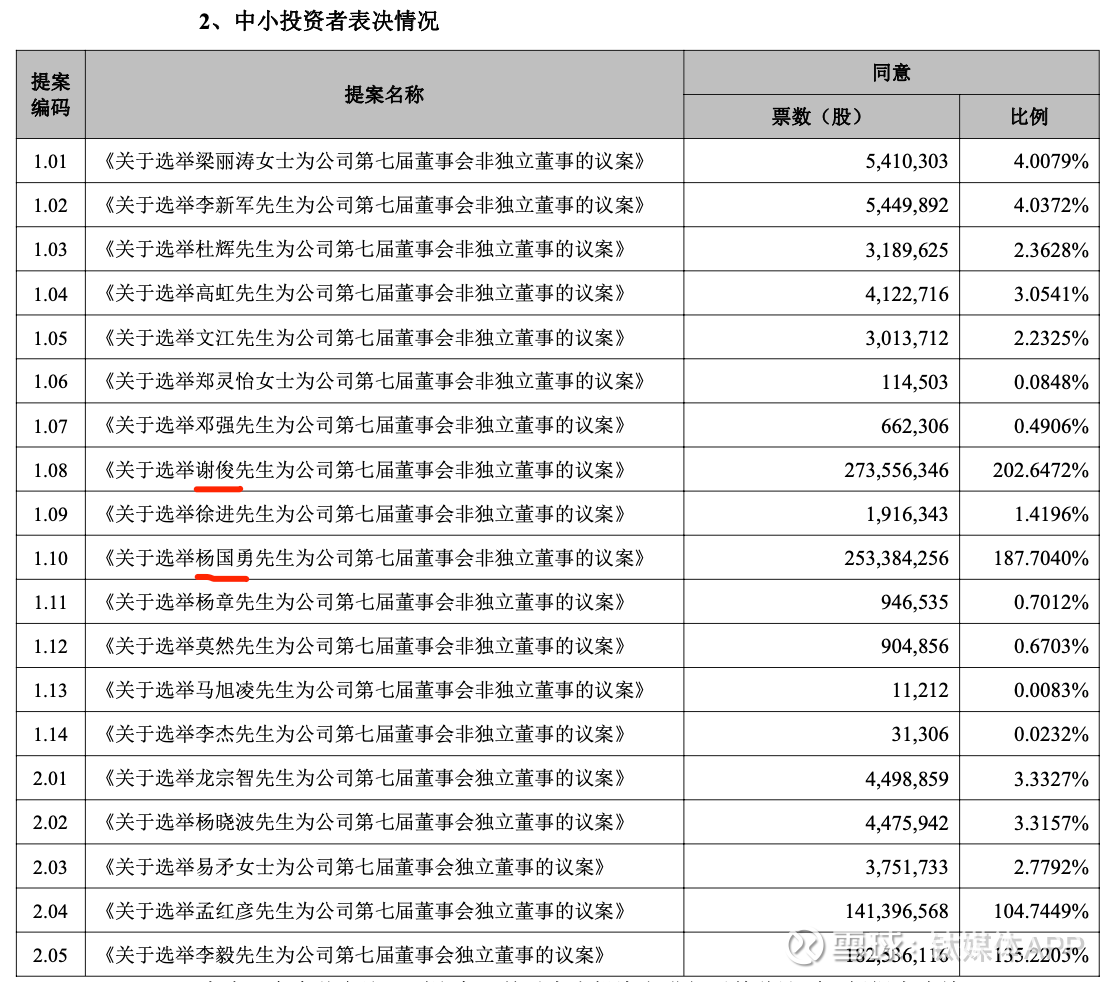 值得一提的是,从中小投资者的表决情况来看,谢俊、杨国勇的票数比例分别为202.65%、187.70%,其他非独立董事候选人均不超过5%。