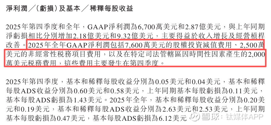 此外,一些技术性因素和外部环境也放大了股价的短期波动。2025年全年GAAP净利润中包含7600万美元的股权投资减值费用及2500万美元的非经常性税务项目费用,虽然这些非经营性因素不影响公司的核心经营能力,但也在短期内对GAAP净利润造成了一定扰动。