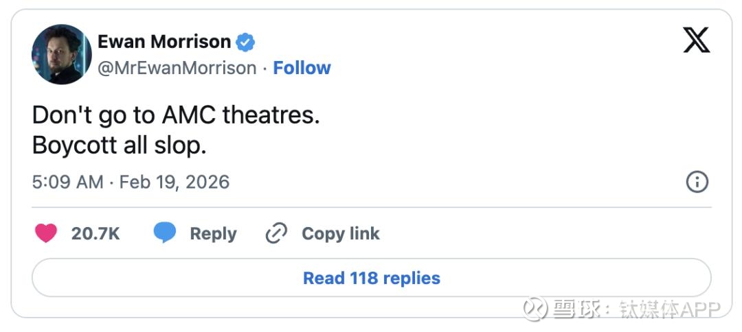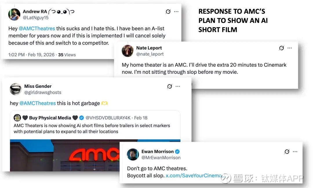 舆论的矛头,很快便集中指向了提供放映场所的AMC院线。尽管从技术上讲,安排放映的是广告公司Screenvision Media,但作为美国最大的院线,AMC成为了这场抵制AI运动最方便的靶心。