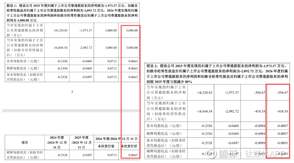 根据公司测算,在2026年净利润3000万元的假设下,发行后的基本每股收益将从0.0713元/股降至0.0663元/股;若亏损仅减少80%,则基本每股收益将为-0.0087元/股,仍处于亏损状态。