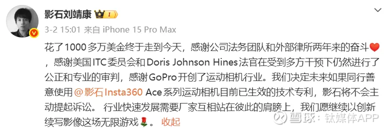 3月2日,影石Insta360创始人刘靖康在社交媒体上的一纸发文,让持续近两年的美国国际贸易委员会(ITC)337调查画上了句号。