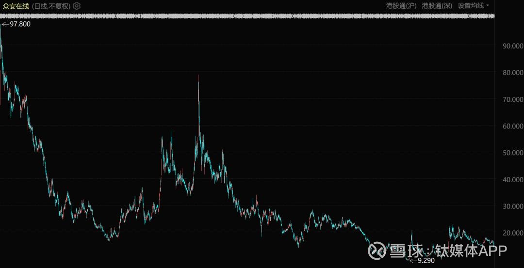 赛道的标志性股票众安在线也是深刻演绎了什么叫出道即巅峰,股价一路下跌,如今已不足发行价的四分之一。