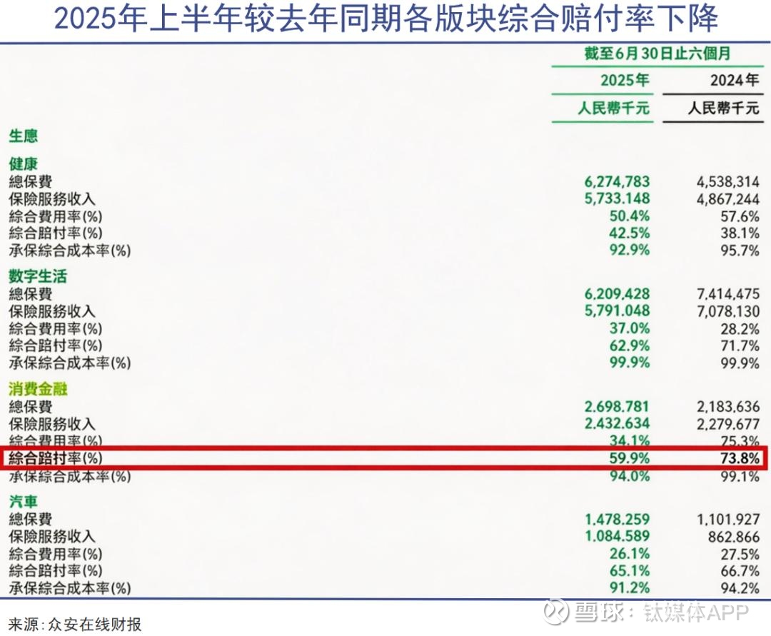 消费金融业务的综合赔付率从2024年同期的73.8%下降为59.9%,数字生活的综合赔付率从2024年同期的71.7%下降为62.9%。