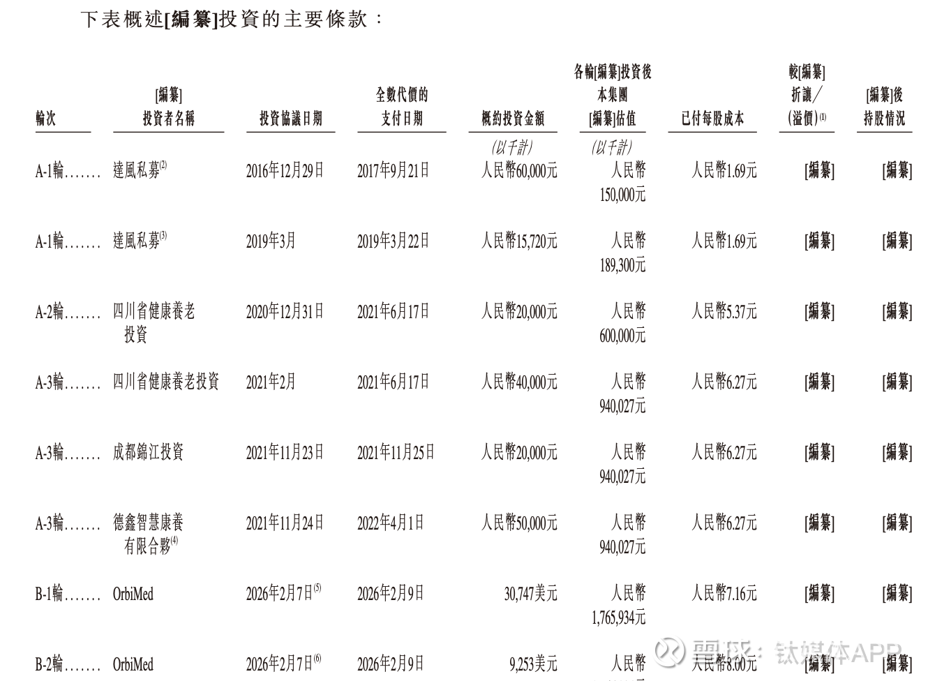 招股书披露,自2016年以来,公司就进行了数轮股权融资,引进的投资者包括了达风私募、四川省健康养老投资、成都锦江投资等,且就在递表前夕的2026年2月,公司还刚刚完成B-1轮和B-2轮融资,投资方均为OrbiMed,合计融资4000万美元。