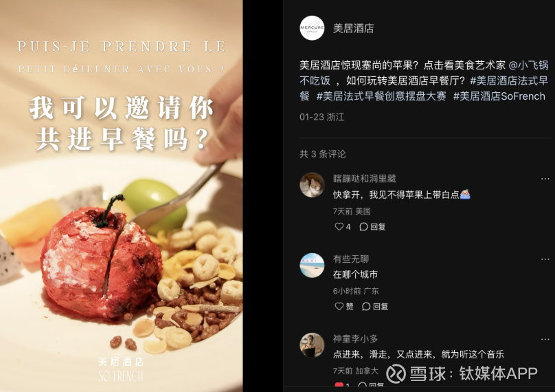 消费者在分享食物时,更多的是在传递一种信息,我在体验特别的东西。酒店品牌可以借助这种自发传播,在不同社交平台收获更多的流量。