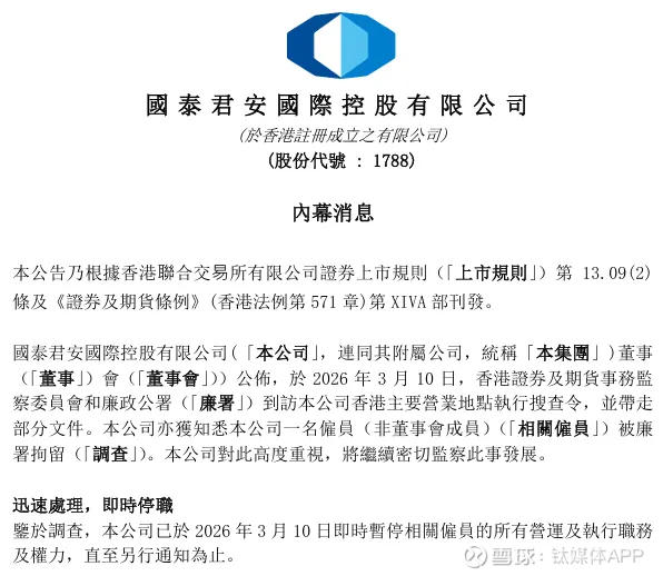 3月10日这天,香港金融圈经历了一场毫无征兆的超级地震。香港廉政公署和证监会(SFC)联手发起了代号为“Fuse”的突击行动,直接推开了国泰君安国际和中信证券香港办公室的大门。