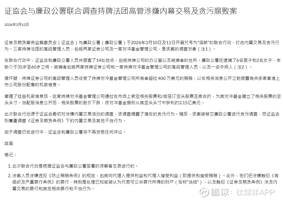 3月12日,香港证监会(SFC)与廉政公署(ICAC)罕见地联合发文,把这起代号为“Fuse”的突击行动细节抖落了出来。