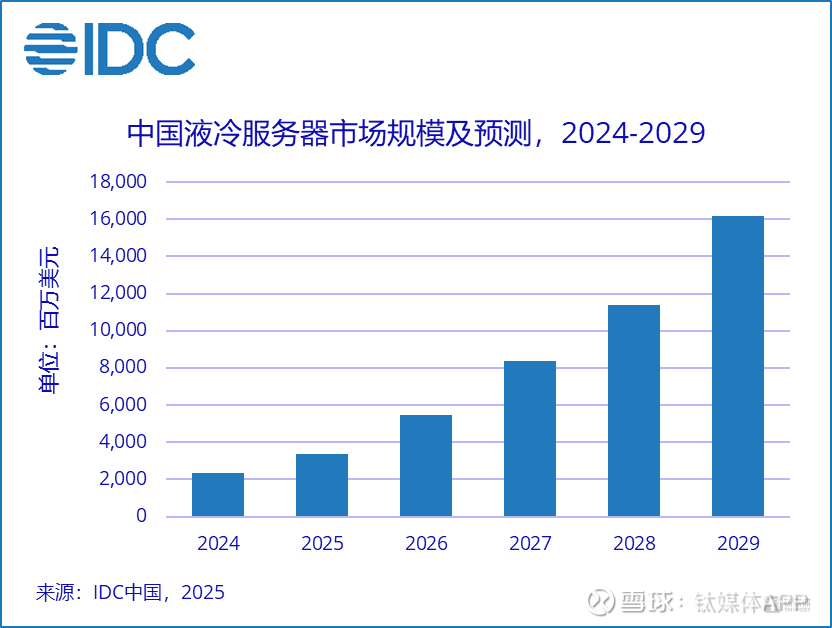 2024年,国内AI算力建设迎来高峰期,各大互联网企业、云计算厂商纷纷加码数据中心,液冷服务器需求激增,电子氟化液市场迎来爆发。IDC预计,2024-2029年中国液冷服务器市场年复合增长率达46.8%,2029年市场规模将达162亿美元;QY Research则预测,2030年全球数据中心浸没式冷却液市场规模将达9.7亿美元,年复合增长率达21.2%。