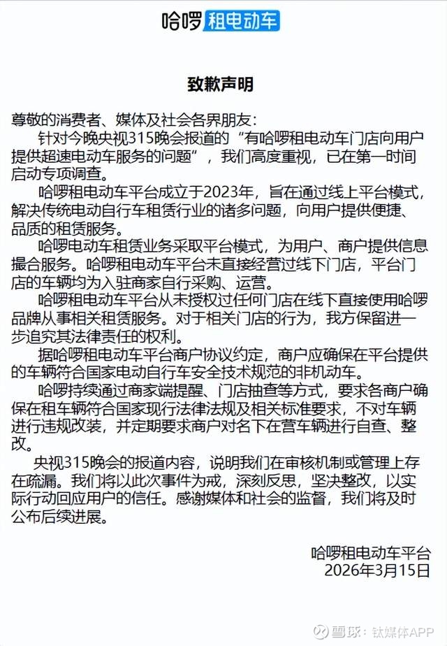 3·15晚会播出后,哈啰租电动车平台发布声明,称平台负责提供租赁及租赁后服务信息撮合,平台门店的车辆均为入驻商家自行采购、运营;同时表示,平台已要求所有商户确保提供车辆符合国标,不对车辆进行违规改装,并已要求商户对在租车辆开展自查整改。