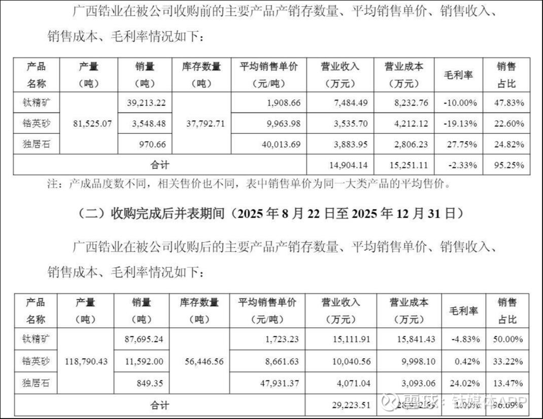 具体来看,广西锆业2025年度实现营业收入45,872.27万元,毛利-287.59万元,净利润-2,577.15万元。其中,在收购完成后并表期间(2025年8月22日至2025年12月31日)实现营业收入30,224.55万元,毛利352.46万元,净利润-905.62万元。