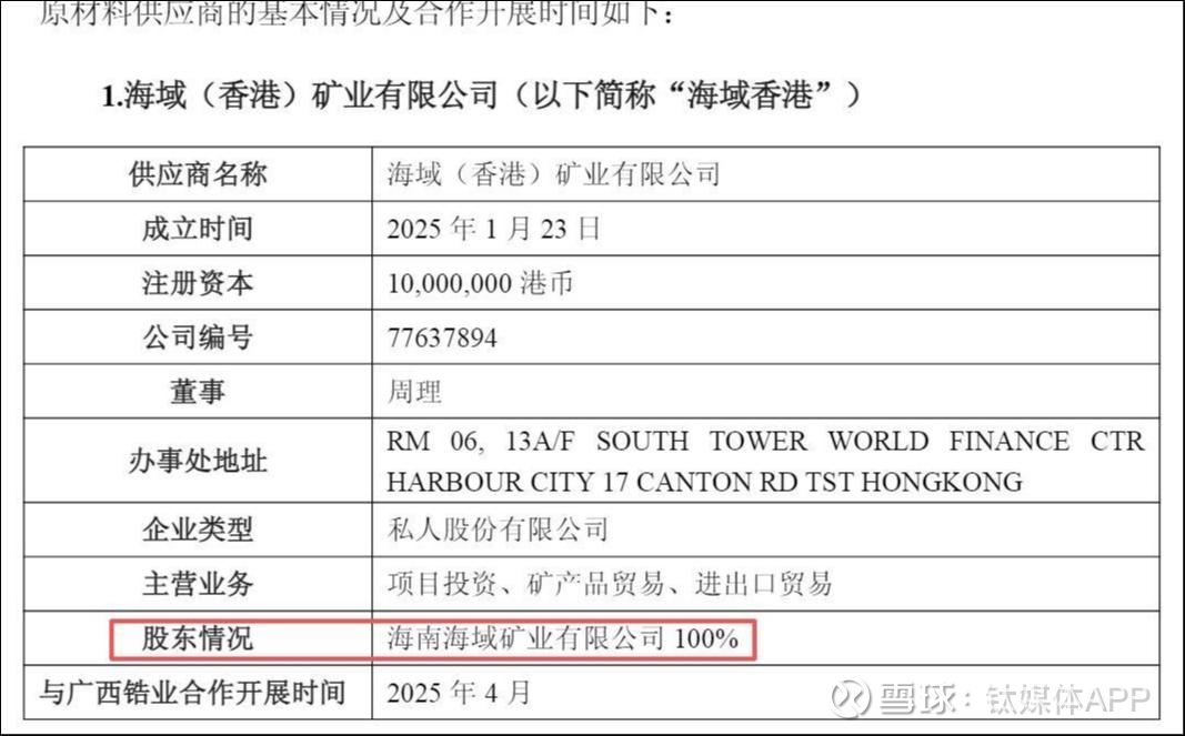 具体来看,海域香港于2025年1月23日成立,同年4月起与广西锆业开展合作,该公司主营项目投资、矿产品贸易、进出口贸易,由海南海域矿业有限公司(以下简称“海南海域”)持股100%。其终端供应商HAIYU(MOZAMBIQUE) MININGCO.,LDA是海南海域的莫桑比克子公司,*ST亚振现任实控人吴涛控制的海南域潇锆钛控股股份有限公司持有海南海域30%股份,且其子吴域潇报告期内曾在海南海域担任董事,因此该终端供应商与公司存在关联关系。