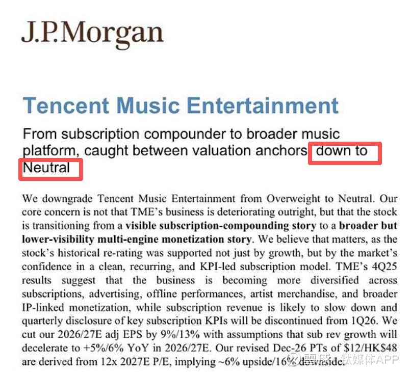 摩根大通还补了一刀,它把腾讯音乐评级从“增持”直接下调至“中性”,美股目标价从30美元腰斩至12美元。理由是:投资逻辑从“清晰的订阅复利”转向“模糊的多元引擎”,市场需要时间重新锚定估值。