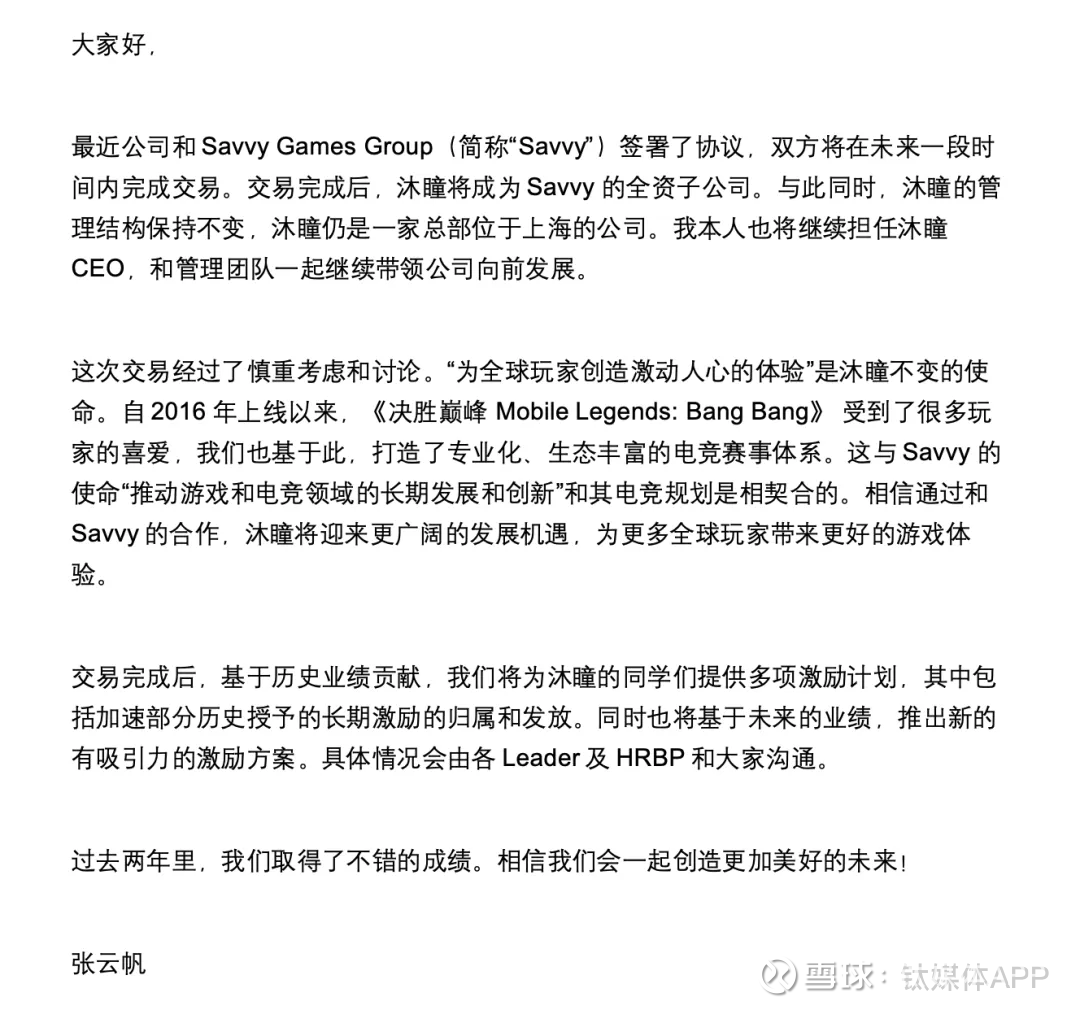 3月20日,沐瞳CEO发布公开信确认,字节跳动已与沙特主权财富基金(PIF)旗下的Savvy Games Group(SGG)签署协议,沐瞳科技将整体出售给后者,成为其全资子公司。