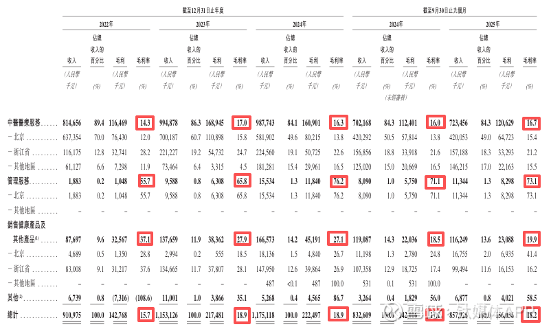 中医医疗服务作为压舱石,2022-2024年收入分别达8.15亿元、9.95亿元、9.88亿元,常年占据超八成营业收入,2025年前三季度进一步增至7.23亿元,核心医院贡献稳定,门诊人次持续领先。