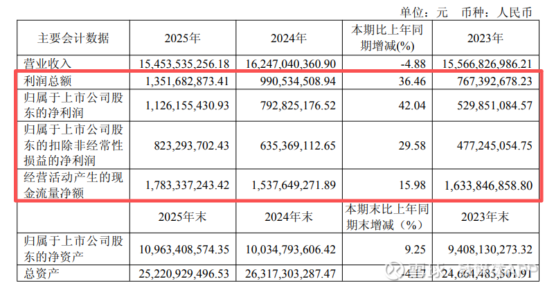 公司全年实现营业收入154.54亿元,同比微降4.88%;但剔除因出售子公司导致的合并报表范围变更影响后,核心业务实际同比增长2.59%;全年实现归母净利润11.26亿元,同比大幅增长42.04%,扣非净利亦达8.23亿元,同比增长29.58%,展现出强劲的盈利增长动能。