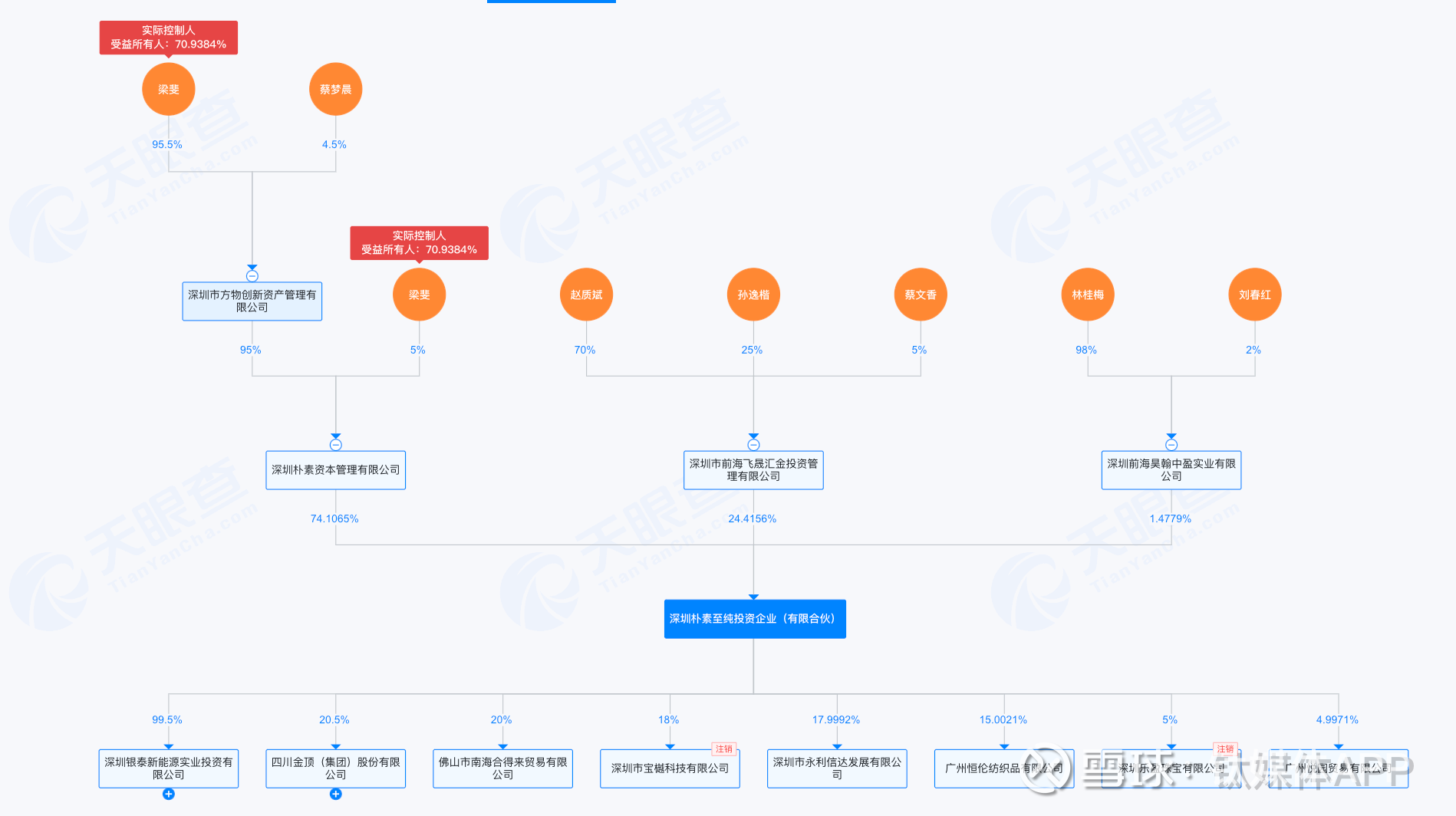 值得一提的是,赵质斌现任深圳市飞晟投资控股集团有限公司总经理,深圳市前海飞晟金融控股有限公司总经理,深圳市秋叶原私募股权投资基金管理有限公司董事长,深圳市前海飞晟汇金投资管理有限公司(以下简称“飞晟汇金”)执行董事、总经理。公司称,截至董事长变更公告日,赵质斌未持有公司股票,除与公司董事梁斐同为股东董事外,与公司其他董事、高级管理人员不存在关联关系。天眼查显示,飞晟汇金持有朴素至纯24.4156%股权,赵质斌又持有飞晟汇金70%股权。