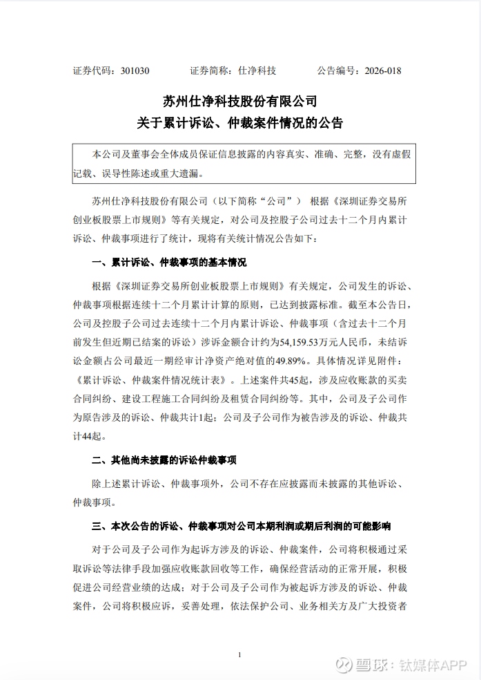 3月27日,仕净科技发布公告披露,过去12个月内累计涉诉金额达5.4亿元,45起案件中44起公司是被告,未结诉讼金额占最近一期经审计净资产的49.89%。其中最大的一笔诉讼金额3.73亿元,原告是资阳勤奕工程管理有限公司等三家地方国资背景公司。