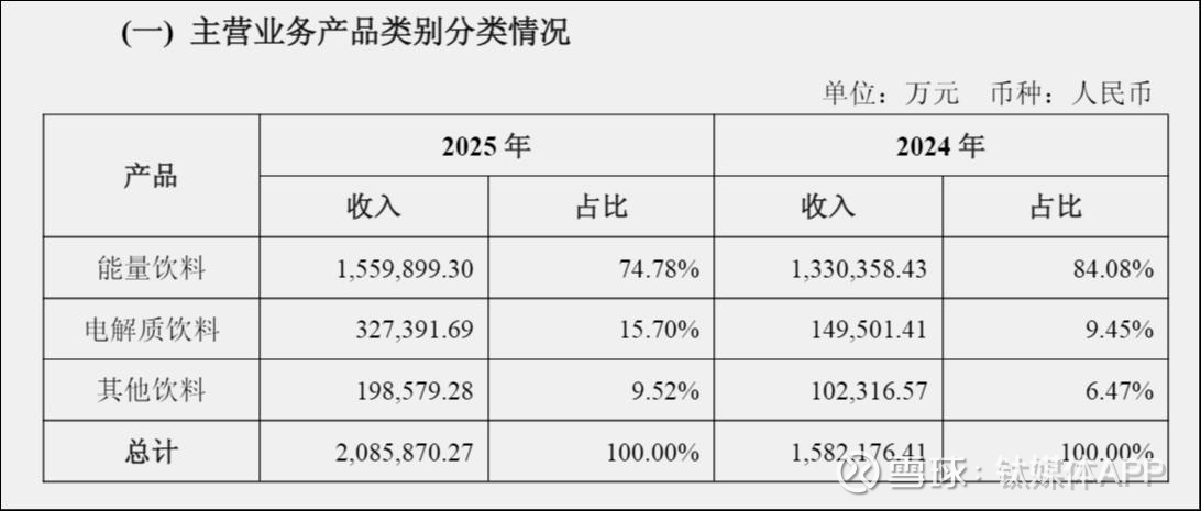近年来,东鹏饮料推进“1+6”多品类发展战略,陆续推出无糖特饮、电解质水、气泡能量饮等新品。但收入结构仍高度集中,2025年能量饮料收入占比仍高达74.78%,电解质饮料、咖啡等赛道拥挤,虽有增长但对整体业绩贡献有限。