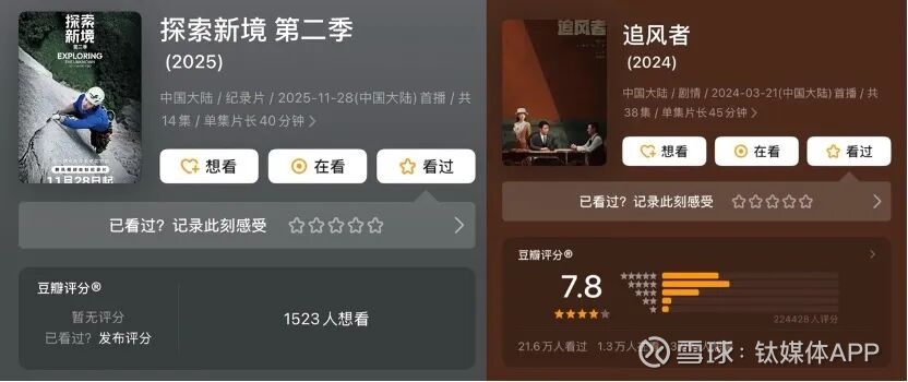 尽管小鱼身边很多爱好攀岩的朋友(非王一博粉丝)都对这档纪录片赞不绝口,但从豆瓣数据看,关心这档小众运动的路人并不多——第二季迄今只有1500多人标记了想看,而作为对比,由王一博主演的《追风者》有超过20万人标记了看过或想看。