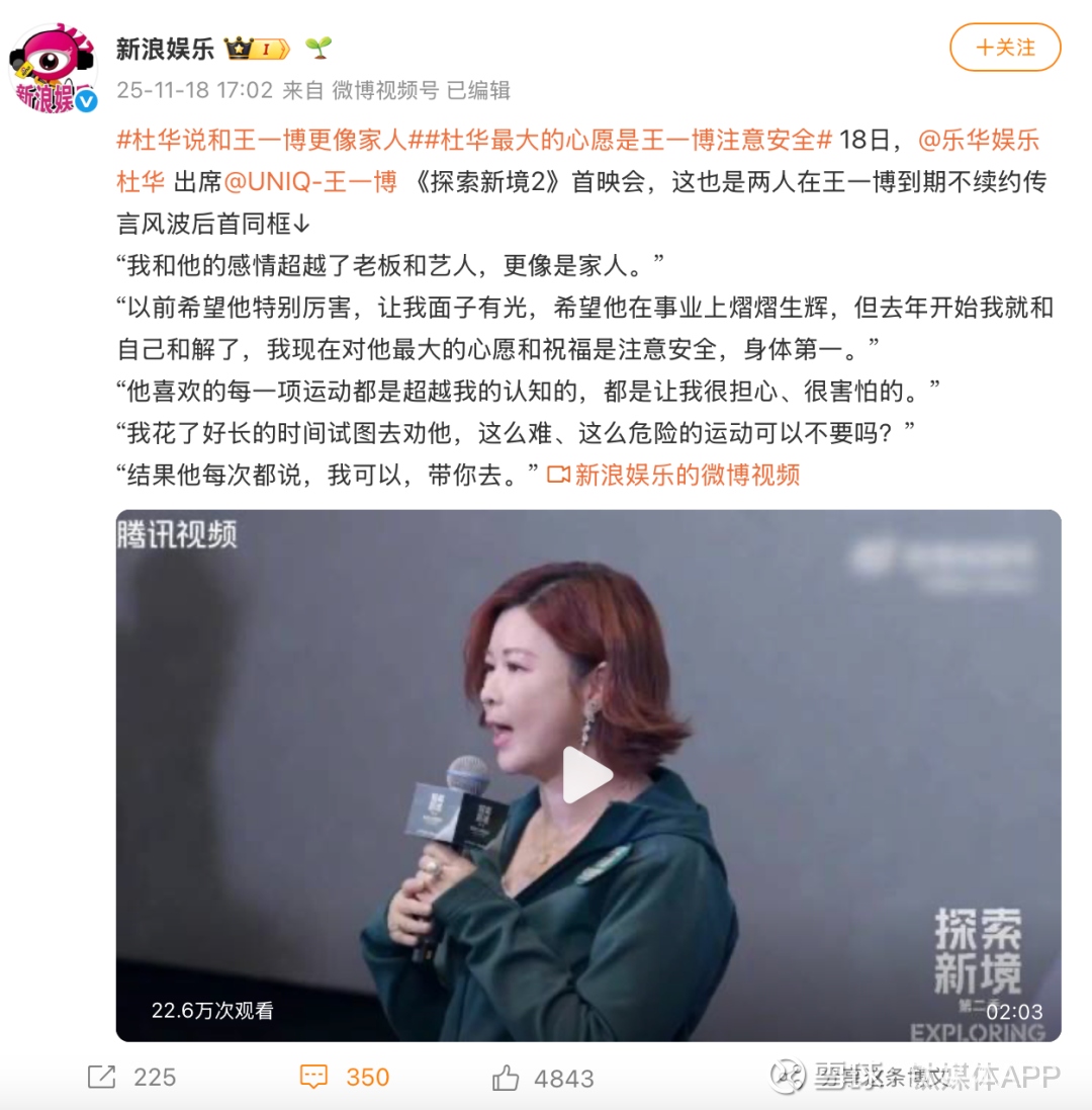 至于乐华,纵使在粉丝眼里有千般不好,但至少在王一博想要做自己这件事上,还是给了他足够多自由的——或者说,不得不给他自由。两年间,他几乎没有接影视项目,把大量时间投入到一档小众纪录片和高风险户外运动上,这些选择在商业逻辑上都不是最优解,但乐华没有阻拦——这本身就是“给自由”最直接的证据。在《探索新境2》发布会上,杜华曾这么评价王一博:“以前特别希望他特别厉害,让我有面子有光,希望他在事业上熠熠生辉。但从去年开始,我跟自己和解了,现在对他最大的期愿是注意安全、身体第一,不要太去冒险了。”