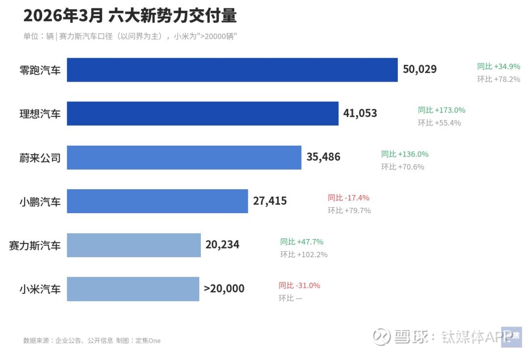 在3月这个季度末的冲量月,最能反映出竞争激烈程度的,依然是新势力车企。零跑以50029辆稳居榜首;理想重回4万辆(41053辆),同比增速(173%)在六家中最高,时隔两年首次超过季度指引上限;蔚来(35486辆)跻身第三,同比涨幅(136%)仅次于理想;小鹏(27415辆)单月和季度都在下滑;问界按照赛力斯汽车口径,销量约为20234辆;小米超20000辆,和上月基本持平。