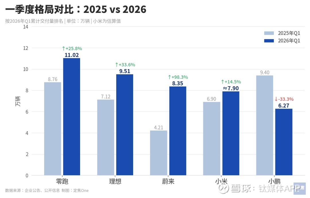 按Q1累计交付量排名,六家新势力再次洗牌:去年Q1,格局还是小鹏、零跑稳居前二,理想紧随其后,蔚来垫底。到了今年,零跑站上榜首,理想、蔚来反超小鹏,小米排名不变。