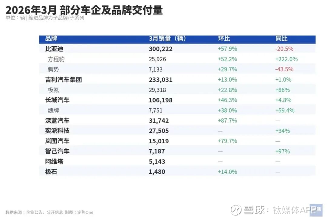 3月大盘当然还是传统巨头撑起来的。比亚迪3月卖出30.02万辆,环比上涨57.9%,一季度累计交付70万辆,稳居行业第一,其中,王朝海洋网仍是基本盘,方程豹、腾势3月分别交付25926辆、7133辆。吉利以23.3万辆紧随其后,旗下极氪品牌单月交付近3万辆(29318辆)。长城汽车同样开始回暖,单月销量10.6万辆,其中魏牌贡献了7751辆。