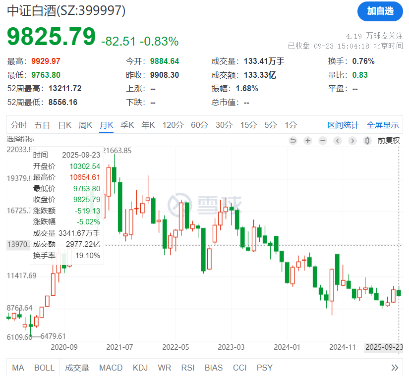 今天市场继续比较极端。科技还是在涨,但是老登股很难受。比如白酒今天继续下跌,白酒这几个交易日调整不少了: