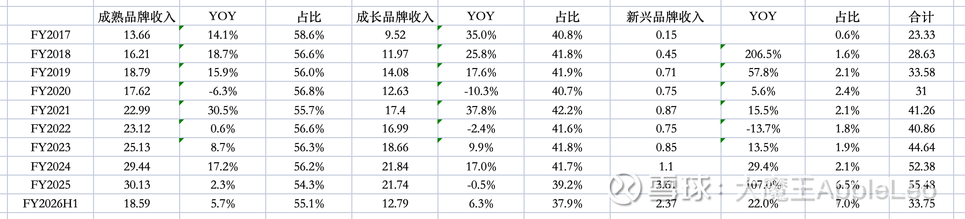 1)先说公司这几年的财务情况,FY2025营收和净利润的增速放缓的原因其实主要是因为FY2024高增速、高基数,24年上半年新收购的两个品牌发力线上,对比行业其他公司24年大幅度下滑,这个增速还是比较亮眼的。