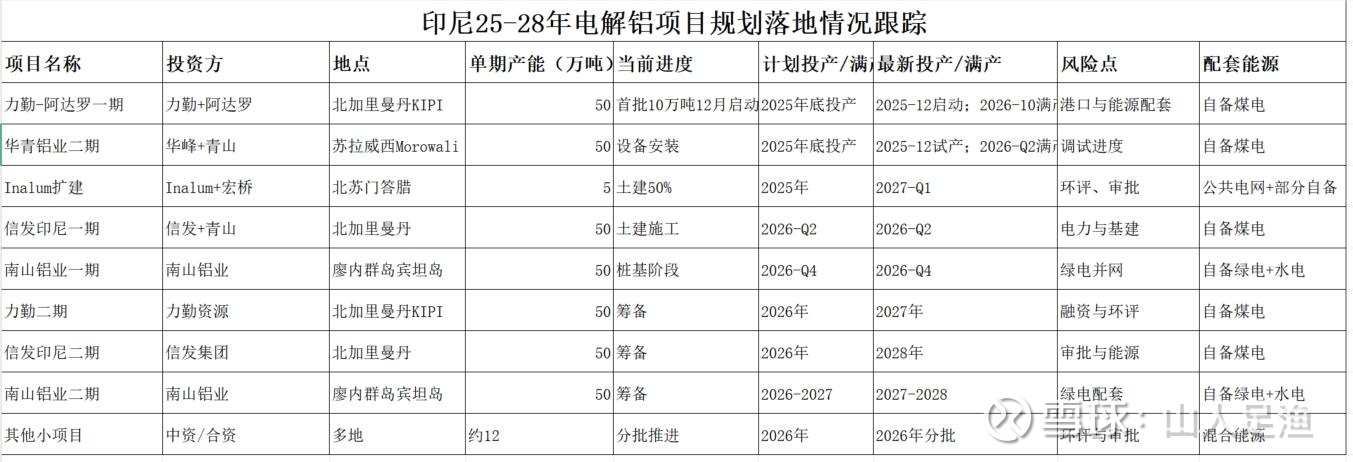 2025 年(预计):全球新增约125-160;中国净增约30-65(置换为主,逼近 4500 万吨红线);海外新增约90-95(印尼约 50-60,俄铝泰舍特 45.85,印度、越南等合计约 40)。