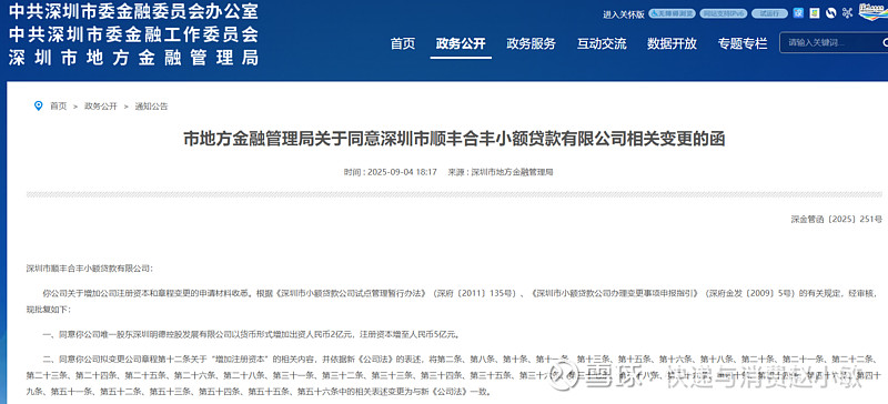 $顺丰控股(SZ002352)$ 【顺丰小贷获批增资至5亿元】9月4日,深圳市地方金融管理局官网发布一则通知,通知显示,同意深圳市顺丰合丰小额贷款有限公司(本文称“顺丰小贷”)变更注册资本以及章程变更,注册资本由3亿元增至5亿元。】$顺丰控股(06936)$