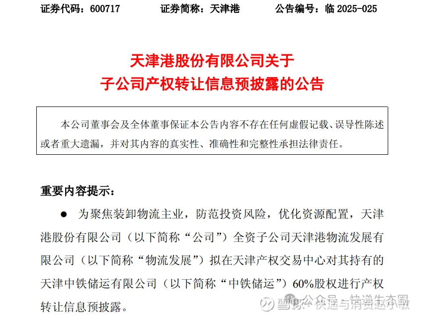 $天津港(SH600717)$ 10月22日,天津港子公司天津港物流发展有限公司拟在天津产权交易中心预挂牌转让其持有的天津中铁储运有限公司60%股权,转让底价将以资产评估结果确定,受让方将公开征集。