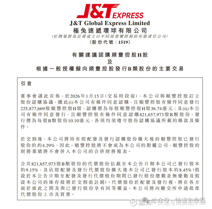 顺丰控股(002352.SZ / 06936.HK)与极兔速递(01519.HK)于2026年1月15日达成的这项战略性相互持股协议。这不仅是一次涉及83亿港元的资本运作,更是中国快递物流行业从“内卷竞争”转向“深层耦合”的里程碑事件。顺丰是全球第四大、世界500强的快递物流公司,极兔速递是创立时间最短、发展速度最快的快递物流公司。