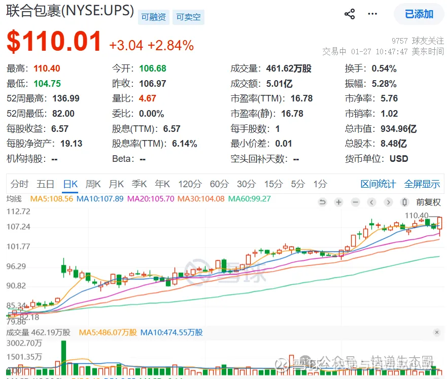 $联合包裹(UPS)$ 1月26日,联合包裹(UPS.US)发布最新财报,财报数据显示,第四季度营收245亿美元,调整后每股收益为2.38美元,均超市场预期;预计2026年收入约为897亿美元,市场估计为879.5亿美元;预计2026年资本支出约为30亿美元,市场预估为37.2亿美元。
