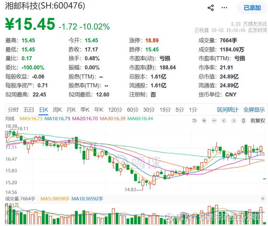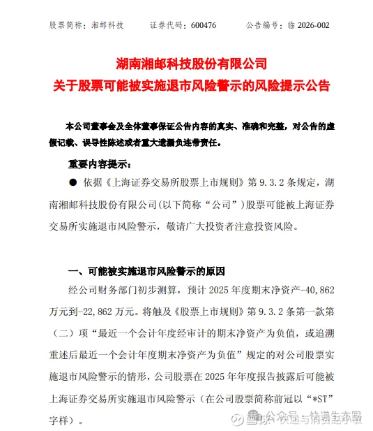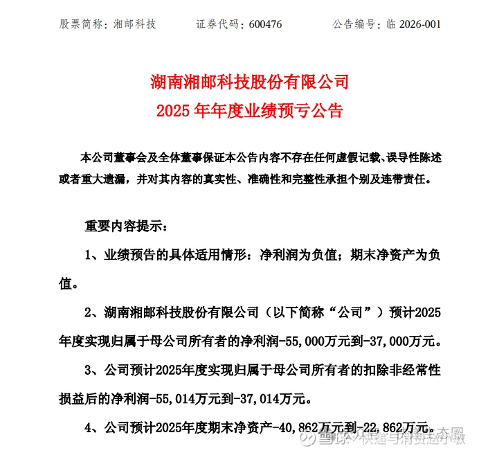 $湘邮科技(SH600476)$ 1月30日,湘邮科技(600476)发布业绩公告,预计2025年度实现归属于母公司所有者的净利润-5.5亿元到-3.7亿元,同比由盈转亏。