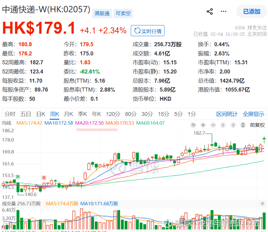 长江证券最新研报表示,中通快递产能投放高峰已过,预期未来资本开支稳中有降;随着龙头份额的重新提升和盈利预期的改善,自由现金流有望延续改善趋势,分红比例有较大提升空间,当前估值倍数处于历史低位,其过去被压制的估值溢价有望得到修复。预计公司2025-2027年归母净利润分别为91.7/104.5/113.2亿元,对应PE分别为14.2/12.5/11.5X,首次覆盖,给予“买入”评级。