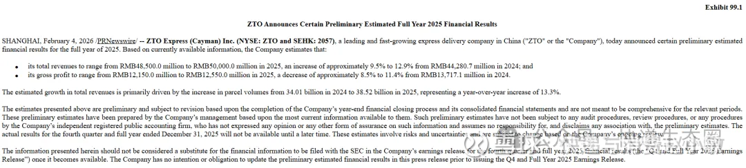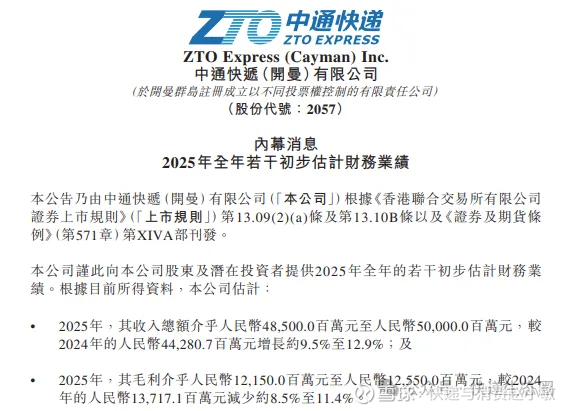 $中通快递(ZTO)$ $中通快递-W(02057)$ 2月4日,中通快递(ZTO.US/02057.HK)发布2025年业绩预告,预计2025年收入总额介乎人民币485亿元至人民币500亿元,较2024年的人民币442.81亿元增长约9.5%至12.9%;预计2025年毛利介乎人民币121.5亿元至人民币125.5亿元,较2024年的人民币137.17亿元减少约8.5%至11.4%。