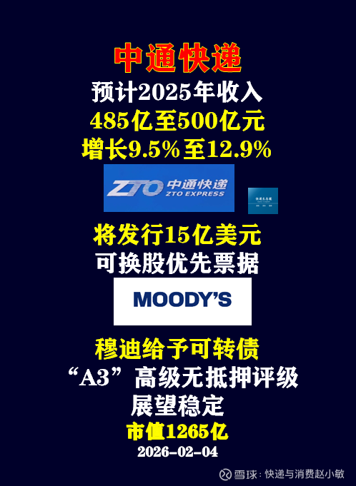 2月4日,国际评级机构穆迪首次授予中通快递(开曼)有限公司(ZTO Express (Cayman) Inc.,简称“中通快递-W”,02057.HK,ZTO.US)“A3”发行人评级,并授予其拟发行的可转债“A3”高级无抵押评级。评级展望为稳定。