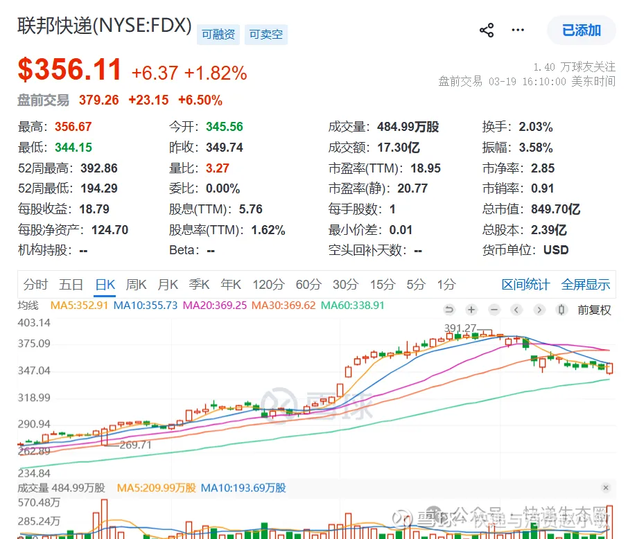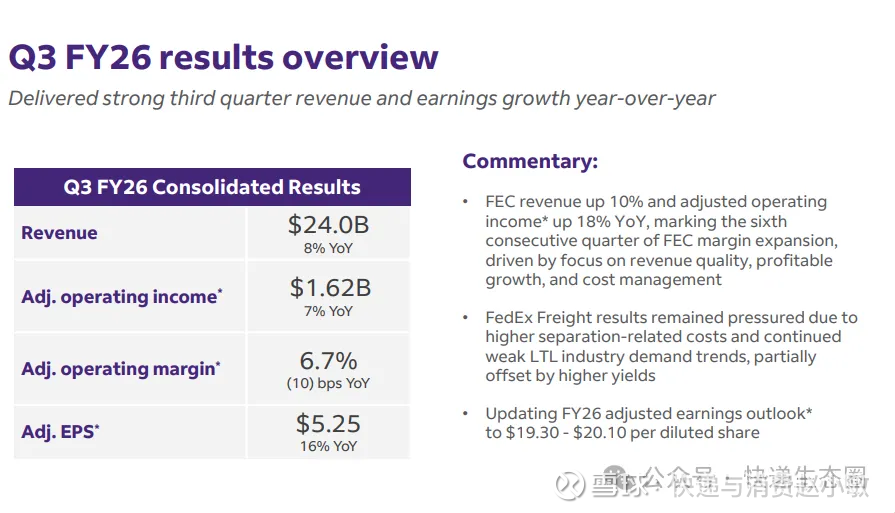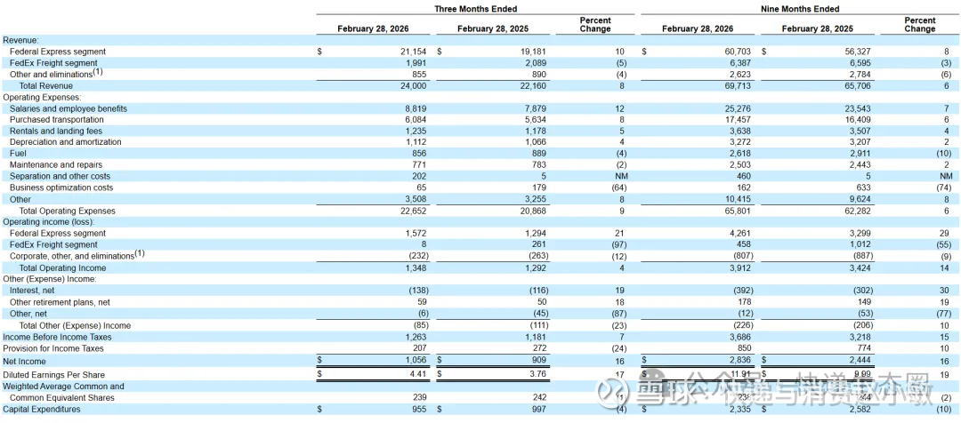 $联邦快递(FDX)$ 3月19日,联邦快递发布发布第三财季截至2月28日业绩,财报数据显示,本财年调整后每股收益为19.30至20.10美元,此前预期为17.80至19美元;第三财季营收240亿美元,分析师预期234.9亿美元;第三财季调整后运营利润16.2亿美元,分析师预期13.7亿美元。联邦快递同时上调全年调整后每股收益指引至19.30至20.10美元,此前为17.80至19美元。