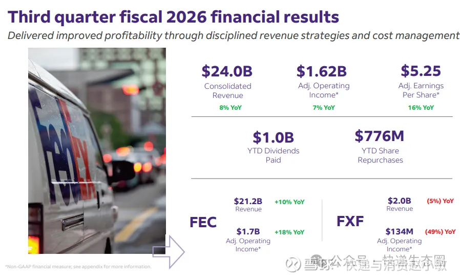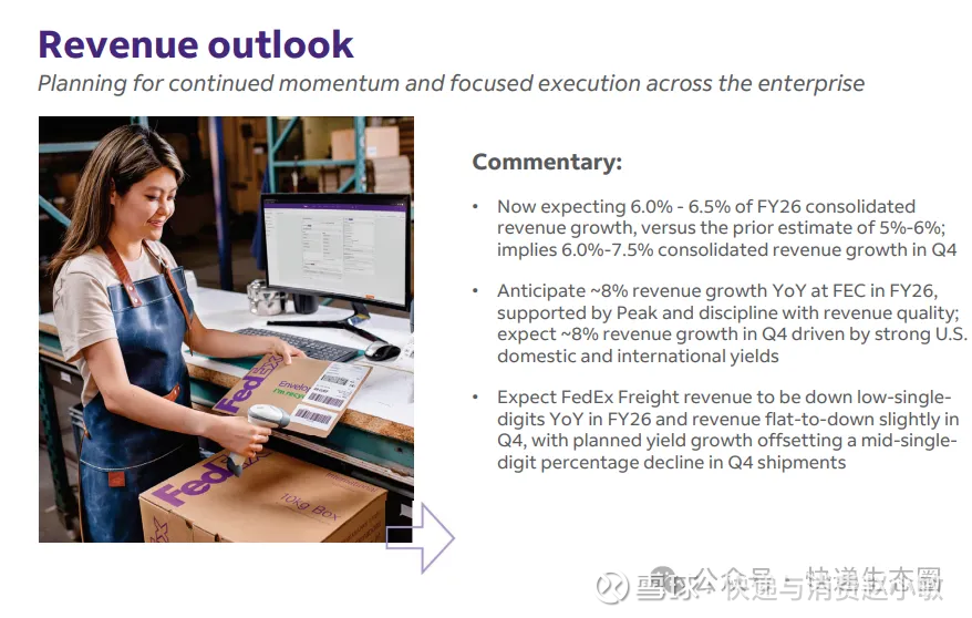 展望未来,联邦快递将其2026财年的调整后每股收益指引从17.80至19.00上调至19.30到20.10,高于18.70的共识预测。该公司还将2026财年的收入预期更新为932亿至936.4亿,之前的指导范围为935亿,共识预期为927.8亿。