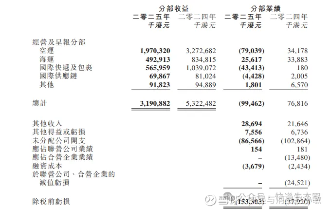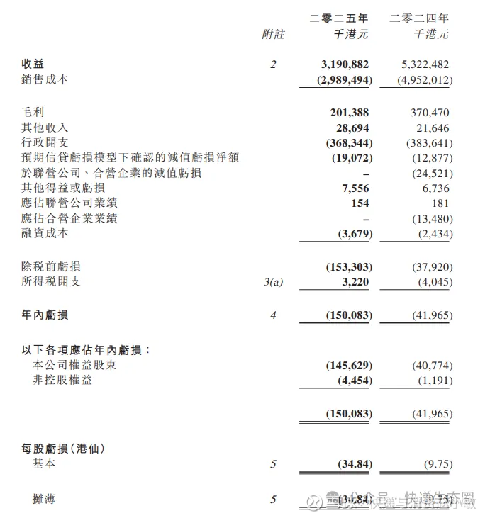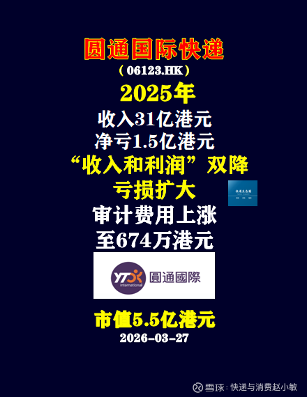 $圆通国际快递(06123)$ 圆通国际快递(06123.HK)发布2025年财报,财报数据显示,收益约为31.91亿港元,同比减少约40.0%。公司权益股东应占亏损约1.456亿港元,同比增长约2.57倍;每股亏损34.84港仙。公司毛利率6.31%,下降9.34%;净资产收益率-12.86%。意味着,圆通国际快递连续两年亏损,并且亏损明显扩大;2025年员工总薪酬2.61亿港元,支付给核数师的费用升至674万港元。$圆通速递(SH600233)$ #直播快递股# #快递生态圈 # #快递消费生态圈#